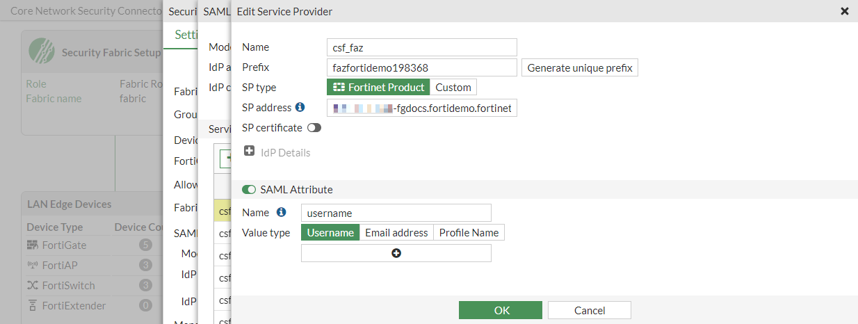 From a root FortiGate IdP, you can edit each of the FortiGate SPs. For example, you can edit a FortiGate SP to generate a new prefix, or you can add or modify SAML attributes. When you generate a new prefix value, it is propagated to the respective downstream FortiGates.