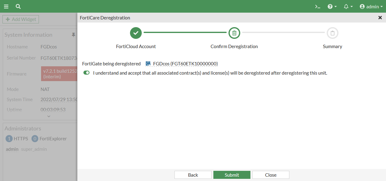 Confirm the FortiGate deregistration then click Submit.