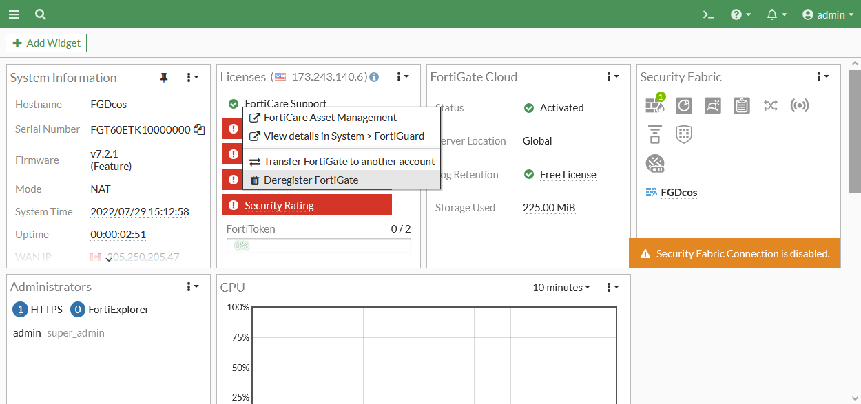 In the License widget, click FortiGate Support and select Deregister FortiGate.