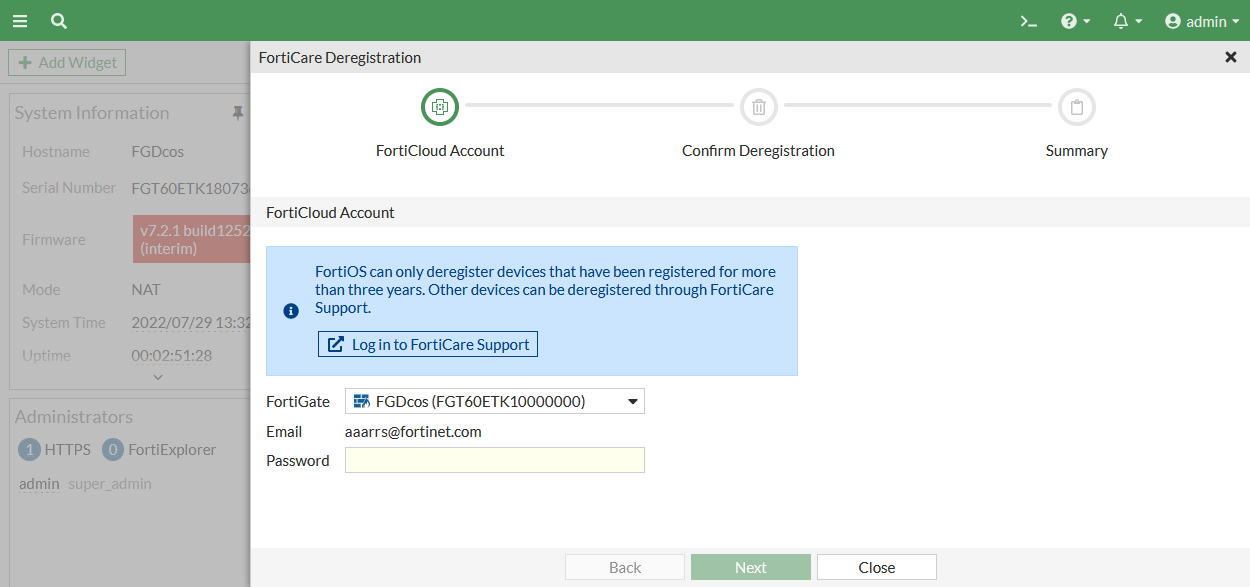 The FortiCare Deregistration pane opens.