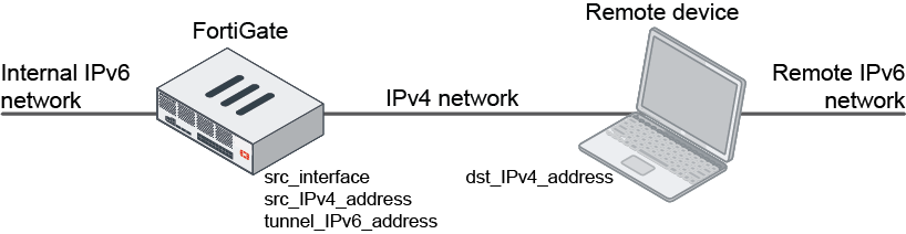 The following tunnel configuration tunnels IPv6 traffic over an IPv4 network. An internal IPv6 interface can be configured under config system interface.