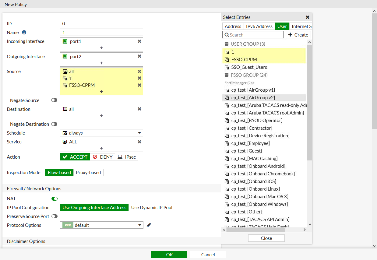 In this example, objects learned by the FortiManager from an Aruba ClearPass device are synchronized to the FortiGate. Some of the objects are then added to a group called ClearPass to make them easier to find in the object list when creating a firewall policy.
