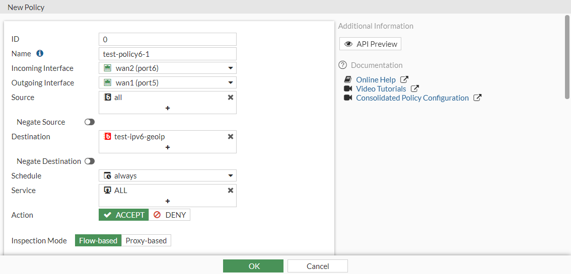 config firewall policy edit 1 set name "test-policy6-1" set srcintf "port6" set dstintf "port5" set srcaddr6 "all" set dstaddr6 "test-ipv6-geoip" set action accept set schedule "always" set service "ALL" set nat enable next end
