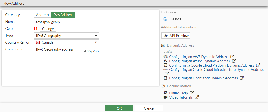 config firewall address6 edit "test-ipv6-geoip" set type geography set color 6 set comment "IPv6 Geography address" set country "CA" next end - Use the IPv6 geography-based address in a policy: