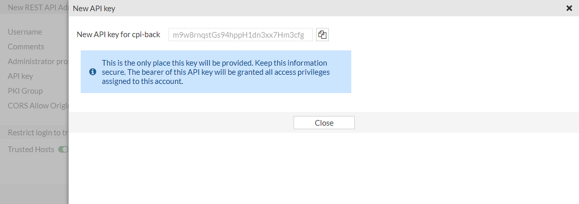 - Copy the API key to a secure location. A new key can be generated if this one is lost or compromised.