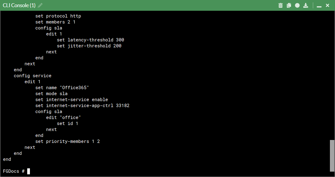 config system sdwan config service edit 3 set name "Office365" set mode sla set internet-service enable set internet-service-app-ctrl 33182 config sla edit "office" set id 2 next end set priority-members 1 2 next end endThe SD-WAN configuration can now be used in as a template for new spokes, as in Example 2.