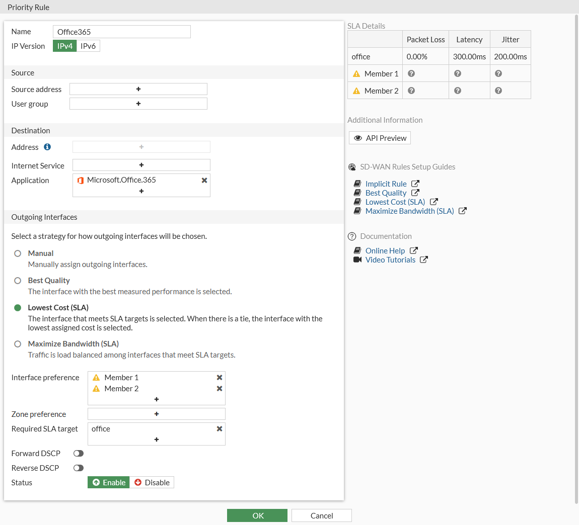 config system sdwan config health-check edit "office" set server "office365.com" set protocol http set sla-fail-log-period 300 set sla-pass-log-period 300 set members 2 1 config sla edit 1 set latency-threshold 300 set jitter-threshold 200 next edit 2 set link-cost-factor latency set latency-threshold 20 next end next end end - Create a service (rule):