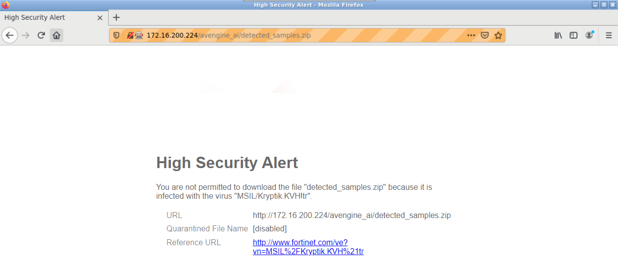config antivirus profile edit "av" set feature-set proxy config http set fortindr block end config ftp set fortindr block end config imap set fortindr block end config pop3 set fortindr block end config smtp set fortindr block end config mapi set fortindr block end config nntp set fortindr block end config cifs set fortindr block end config ssh set fortindr block end next end - Add the AV profile to a firewall policy. When potential infections are blocked by FortiNDR inline inspection, a replacement message appears (see Replacement messages for more information). An infection blocked over HTTP looks similar to the following: