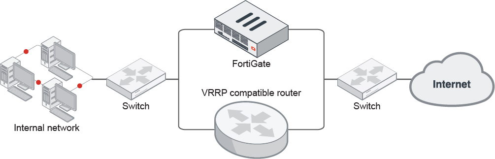 The most common VRRP application is to provide redundant default routers between an internal network and the internet. The default routers can be FortiGates or any routers that support VRRP.