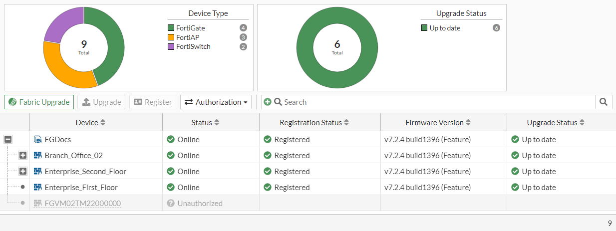 The deauthorized FortiGate's status is now listed as Unauthorized.