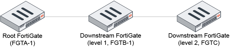 In this Security Fabric, the root FortiGate (FGTA-1) has fabric-object-unification set to default so the Fabric objects can be synchronized to the downstream FortiGate. The level 1 downstream FortiGate (FGTB-1) has configuration-sync set to local, so it will not apply the synchronized objects locally. The level 2 downstream FortiGate (FGTC) has configuration-sync set to default, so it will apply the synchronized objects locally.