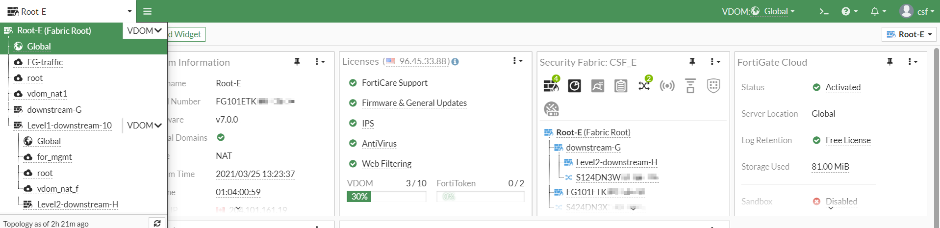 The Security Fabric is enabled, and configured so that downstream interfaces from all VDOMs can allow other Security Fabric devices to join.