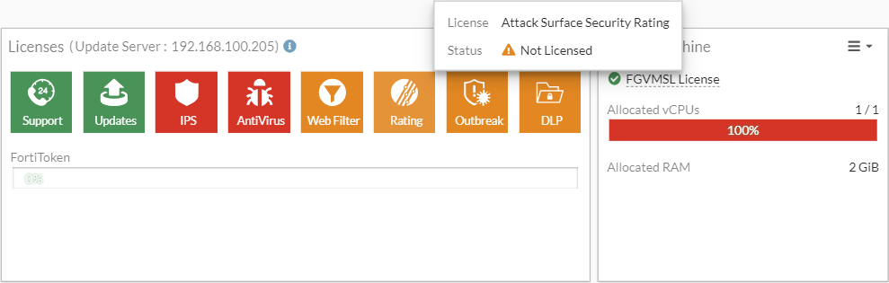 On the System > FortiGuard page, note that Firmware & General Updates is licensed, but Attack Surface Security Rating is not.