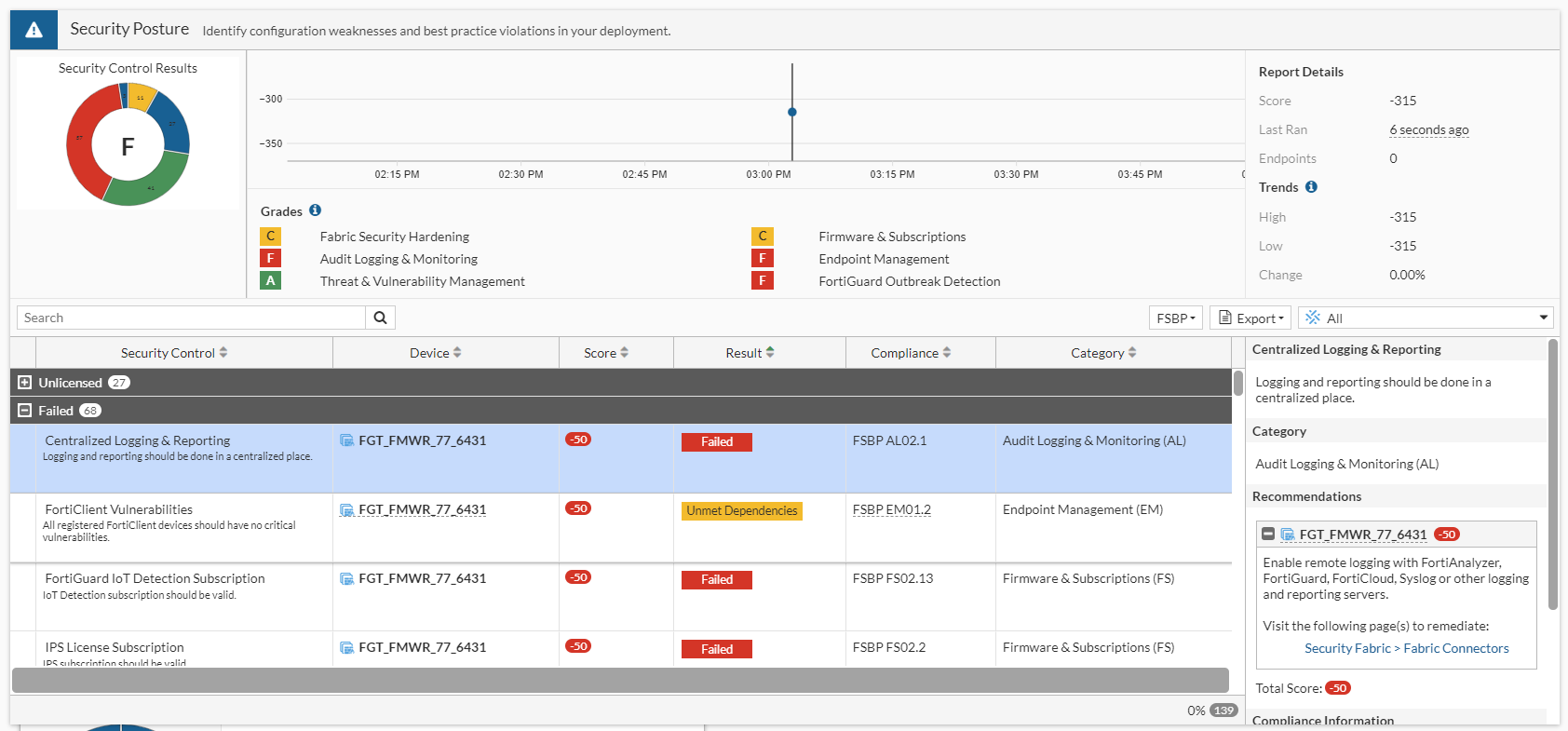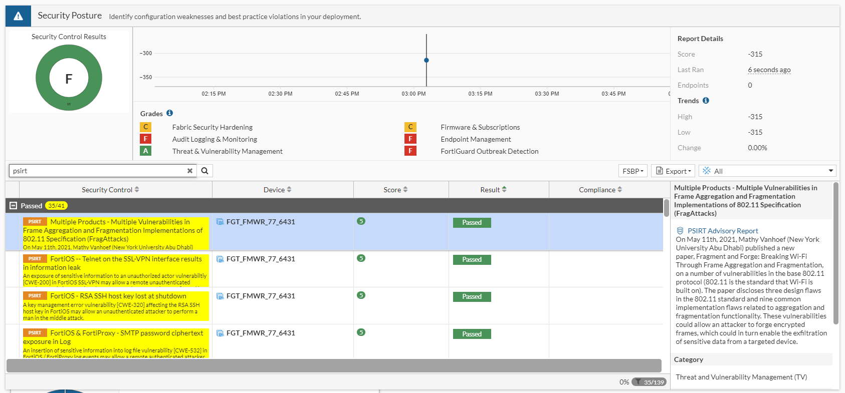 Starting in 7.4.1, PSIRT related packages and functionalities are re-positioned from the Security Rating entitlement into the Firmware entitlement. This allows more customers with the basic Firmware entitlement to have access to the latest PSIRT package updates, which can be executed under Security Fabric > Security Rating > Security Posture checks.