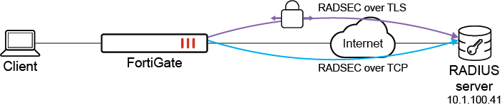 FortiOS supports RADSEC clients in order to secure the communication channel over TLS for all RADIUS traffic, including RADIUS authentication and RADIUS accounting over port 2083. A FortiGate acting as a TLS client can initiate the TLS handshake with a remote RADIUS server. Administrators can specify a client certificate, perform a server identity check (enabled by default), and verify against a particular trust anchor (CA certificate). During a TLS handshake, the SNI check will use the RADIUS server FQDN if configured.