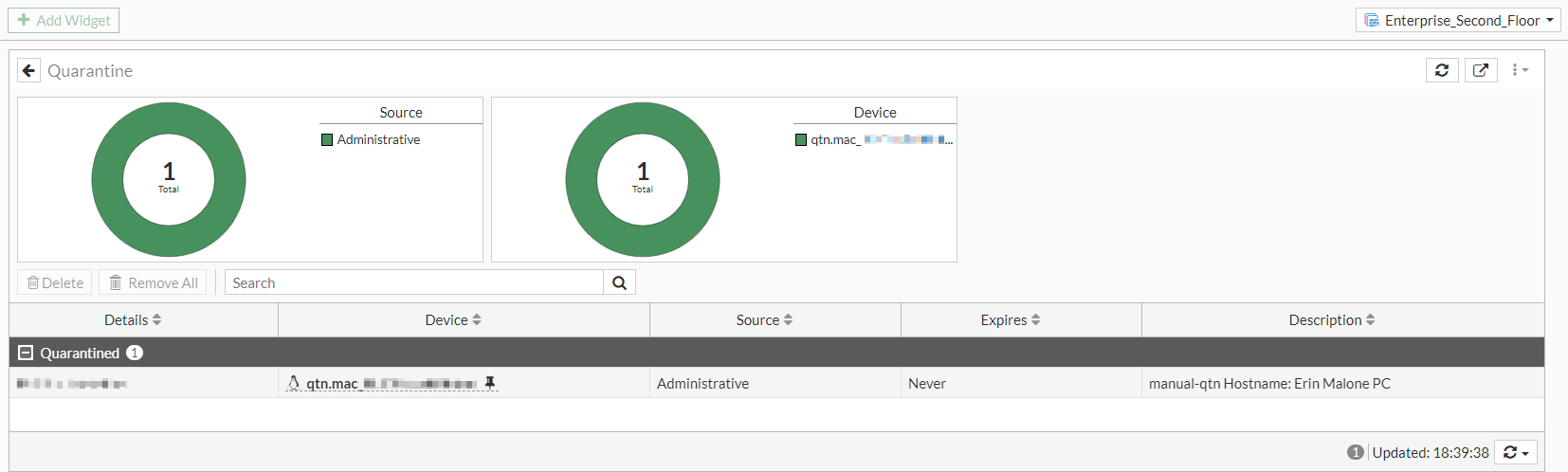 In the top-right corner, use the dropdown to select the FortiGate in which this host was quarantined. In this example, it is the Enterprise_Second_Floor FortiGate.
