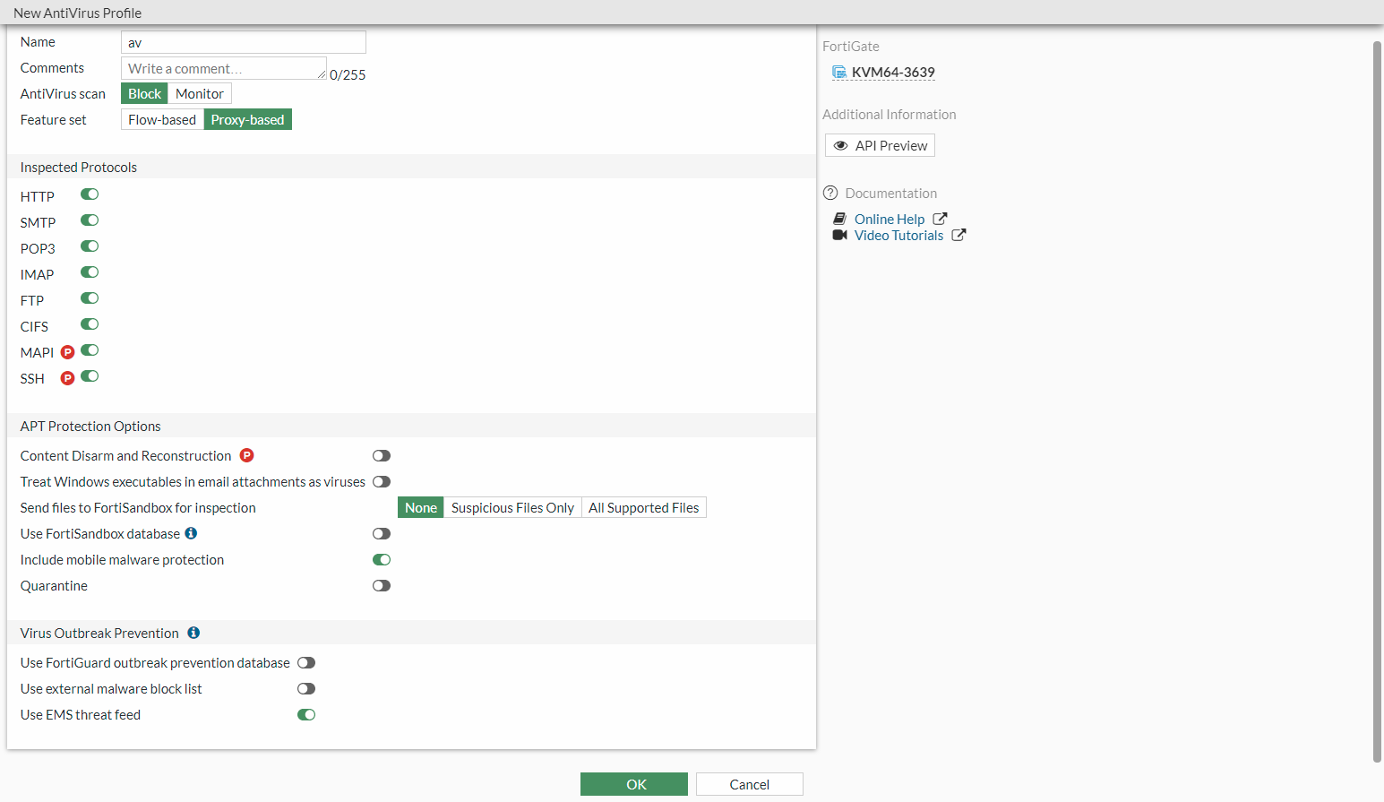 config antivirus profile edit "av" config http set av-scan block end config ftp set av-scan block end config imap set av-scan block end config pop3 set av-scan block end config smtp set av-scan block end config cifs set av-scan block end set external-blocklist-enable-all enable set ems-threat-feed enable next end