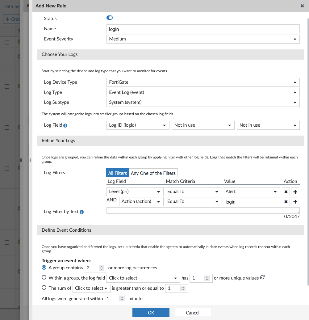 On the FortiAnalyzer, configure an event handler for the automation stitch. In this example, the event handler is triggered by two or more invalid log in attempts to the FortiGate in less than one minute. See Creating a custom event handler in the FortiAnalyzer Administration Guide for more information.