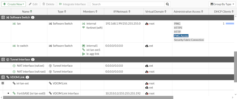 After the LAN extension VDOM connects to FortiSASE, observe from the Global VDOM under Network > Interfaces: