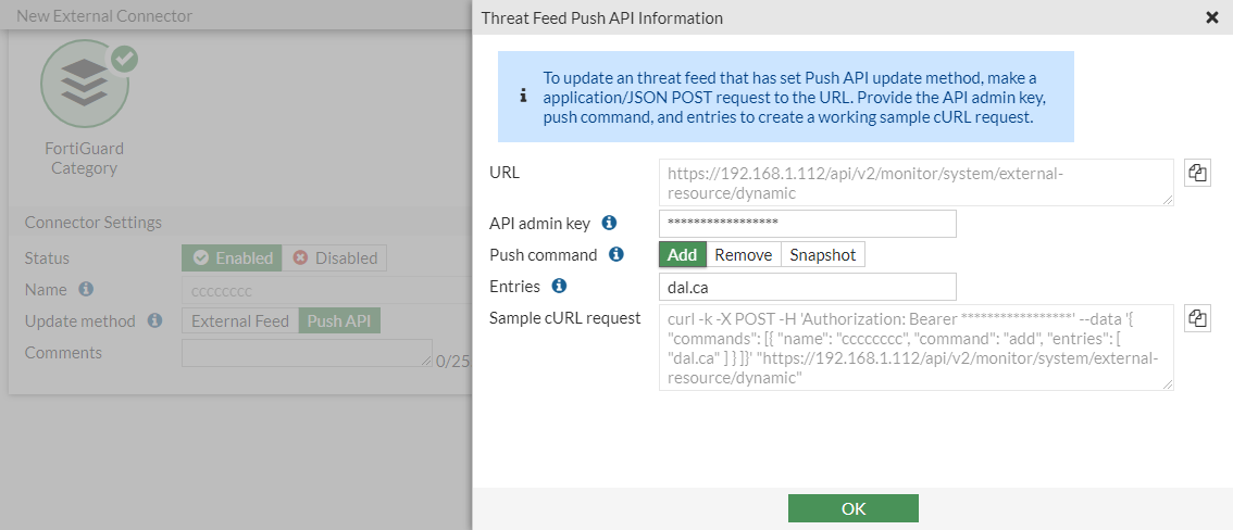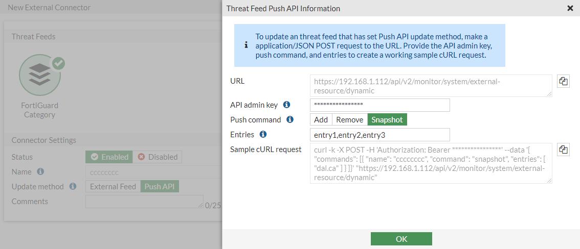 Sample cURL request: copy this cURL command to perform the push API update on the FortiGate against the list (cccccccc).