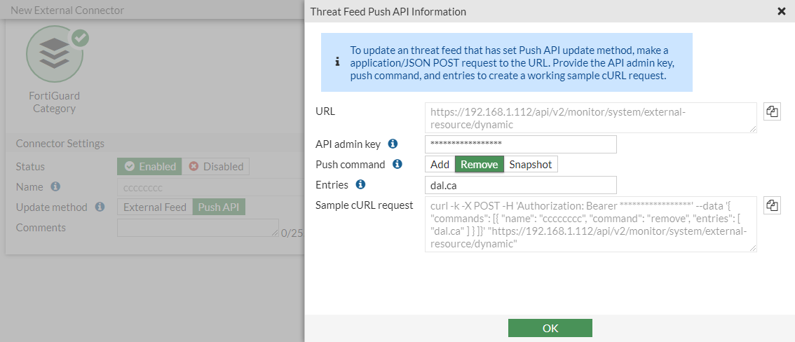 In the following example, a FortiGuard Category external feed is used to show the different API push options. A FortiGuard license is required when using a FortiGuard Category external feed in a web filter profile in a policy in NGFW profile or policy mode.