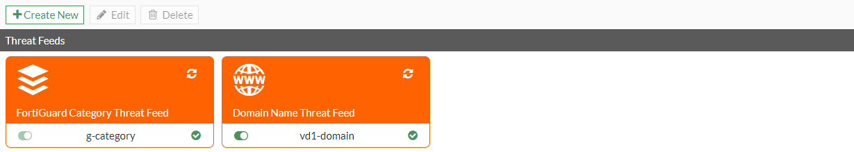 When multi-VDOM mode is enabled, a threat feed external connector can be defined in global or within a VDOM. Global threat feeds can be used in any VDOM, but cannot be edited within the VDOM. FortiGuard category and domain name-based external feeds have an added category number field to identify the threat feed. The threat feed name in global must start with g-. Threat feed names in VDOMs cannot start with g-.