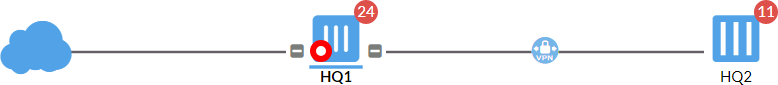 The root FortiGate (HQ1) is connected by the downstream FortiGate (HQ2) with VPN icon in the middle.
