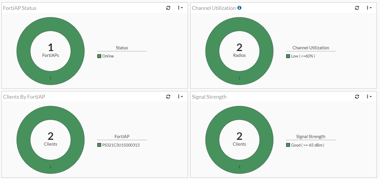 The WiFi dashboard provides an overview of your WiFi network's performance, including FortiAP status, channel utilization, WiFi clients and associated information, login failures, and signal strength.