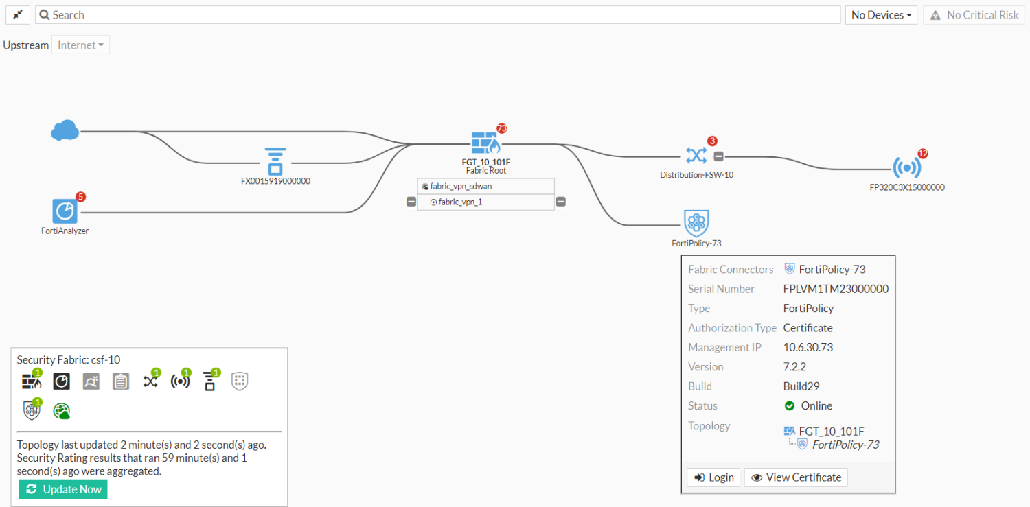 FortiPolicy can be added to the Security Fabric. When FortiPolicy joins the Security Fabric and is authorized in the Security Fabric widget, it appears in the Fabric topology pages. A FortiGate can grant permission to FortiPolicy to perform firewall address and policy changes.