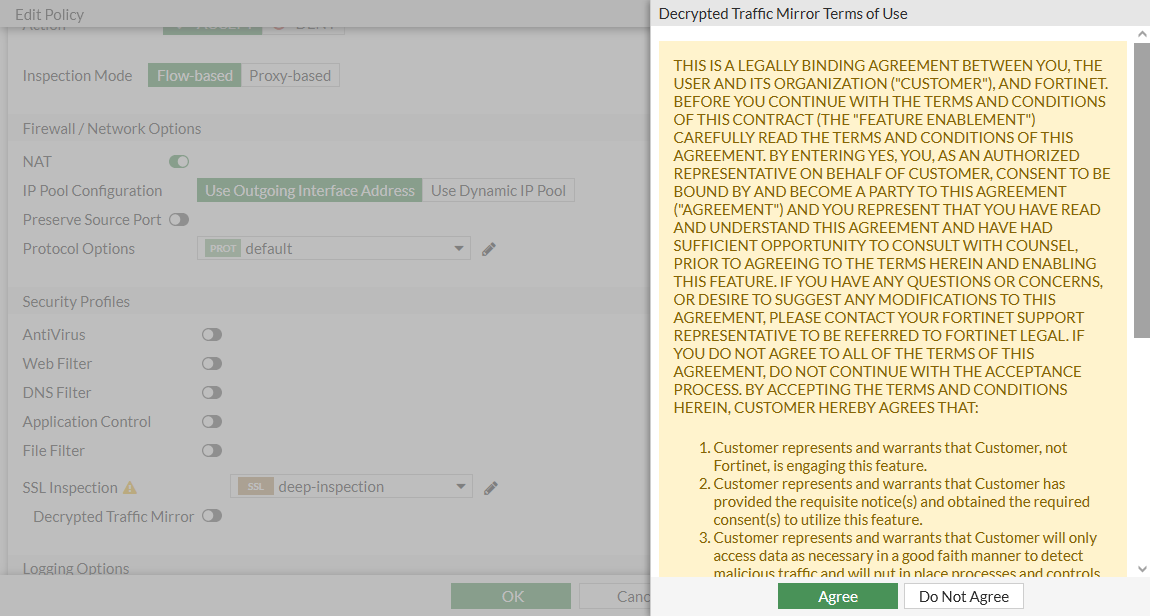 config firewall policy edit 1 set name "mirror-policy" set srcintf "port1" set dstintf "port2" set srcaddr "all" set dstaddr "all" set action accept set schedule "always" set service "ALL" set nat enable set ssl-ssh-profile "deep-inspection" set decrypted-traffic-mirror "SSL-to-port3" THIS IS A LEGALLY BINDING AGREEMENT BETWEEN YOU, THE USER AND ITS ORGANIZATION ("CUSTOMER"), AND FORTINET. BEFORE YOU CONTINUE WITH THE TERMS AND CONDITIONS OF THIS CONTRACT (THE "FEATURE ENABLEMENT") CAREFULLY READ THE TERMS AND CONDITIONS OF THIS AGREEMENT. BY ENTERING YES, YOU, AS AN AUTHORIZED REPRESENTATIVE ON BEHALF OF CUSTOMER, CONSENT TO BE BOUND BY AND BECOME A PARTY TO THIS AGREEMENT ("AGREEMENT") AND YOU REPRESENT THAT YOU HAVE READ AND UNDERSTAND THIS AGREEMENT AND HAVE HAD SUFFICIENT OPPORTUNITY TO CONSULT WITH COUNSEL, PRIOR TO AGREEING TO THE TERMS HEREIN AND ENABLING THIS FEATURE. IF YOU HAVE ANY QUESTIONS OR CONCERNS, OR DESIRE TO SUGGEST ANY MODIFICATIONS TO THIS AGREEMENT, PLEASE CONTACT YOUR FORTINET SUPPORT REPRESENTATIVE TO BE REFERRED TO FORTINET LEGAL. IF YOU DO NOT AGREE TO ALL OF THE TERMS OF THIS AGREEMENT, DO NOT CONTINUE WITH THE ACCEPTANCE PROCESS. BY ACCEPTING THE TERMS AND CONDITIONS HEREIN, CUSTOMER HEREBY AGREES THAT: 1. Customer represents and warrants that Customer, not Fortinet, is engaging this feature. 2. Customer represents and warrants that Customer has provided the requisite notice(s) and obtained the required consent(s) to utilize this feature. 3. Customer represents and warrants that Customer will only access data as necessary in a good faith manner to detect malicious traffic and will put in place processes and controls to ensure this occurs. 4. Customer represents and warrants that Customer has the right to enable and utilize this feature, and Customer is fully in compliance with all applicable laws in so doing. 5. Customer shall indemnify Fortinet in full for any of the above certifications being untrue. 6. Customer shall promptly notify Fortinet Legal in writing of any breach of these Terms and Conditions and shall indemnify Fortinet in full for any failure by Customer or any of its employees or representatives to abide in full by the Terms and Conditions above. 7. Customer agrees that these Terms and Conditions shall be governed by the laws of the State of California, without regards to the choice of laws provisions thereof and Customer hereby agrees that any dispute related to these Terms and Conditions shall be resolved in Santa Clara County, California, USA, and Customer hereby consents to personal jurisdiction in Santa Clara County, California, USA. Do you want to continue? (y/n) y next end