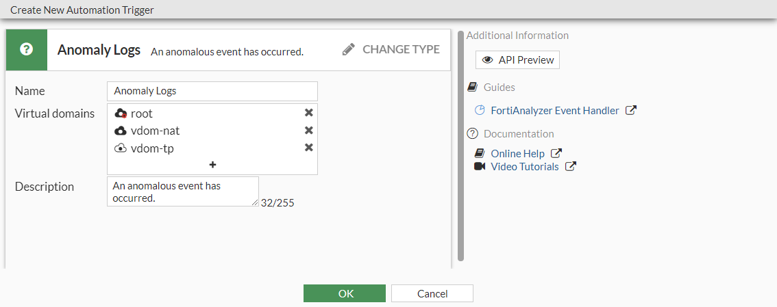 config system automation-trigger edit "Anomaly Logs" set event-type anomaly-logs set vdom "root" "vdom-nat" "vdom-tp" next end - Configure the action: