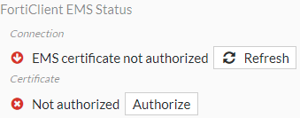 Go to Security Fabric > Fabric Connectors and edit the FortiClient EMS connector. The connection status should now say that the certificate is not authorized.