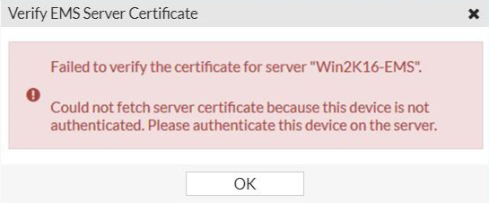 # execute fctems verify Win2K16-EMS certificate not configured/verified: 2 Could not verify server certificate based on current certificate authorities. Error 1--92-60-0 in get SN call: EMS Certificate is not signed by a known CA.