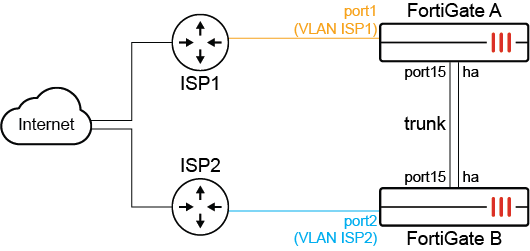 In this example, two FortiGates in an HA cluster are connected to two ISP routers. Instead of connecting to external L2 switches, each FortiGate connects to each ISP router on the same hardware switch port on the same VLAN. A trunk port connects the two FortiGates to deliver the 802.1Q tagged traffic to the other. A full mesh between the FortiGate cluster and the ISP routers is achieved where no single point of failure will cause traffic disruptions.