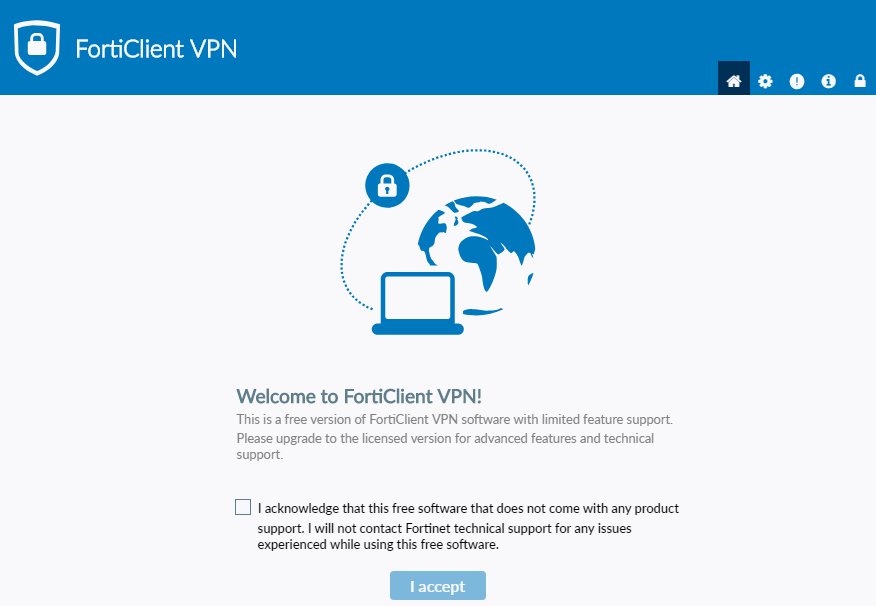 When the free VPN client is run for the first time, it displays a disclaimer. You cannot configure or create a VPN connection until you accept the disclaimer and click I accept: