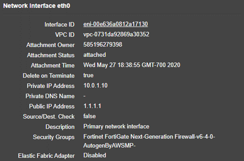 - On the cloud FortiGate-VM EC2 instances, ensure that port1 and port2 both have Source/Dest. Check set to false. This allows the FortiGate to accept and route traffic to and from a different network.