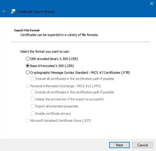 - For the file format, select Base-64 encoded X.509 (.CER), then click Next.