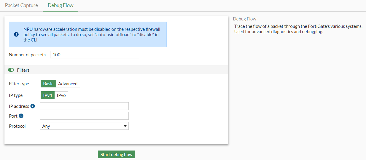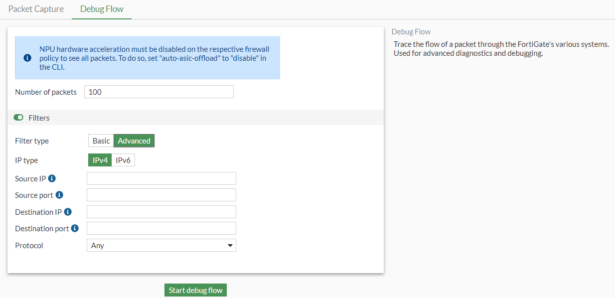 Go to Network > Diagnostics and select the Debug Flow tab.