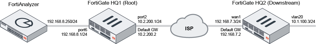 The root FortiGate (HQ1) is connected by the downstream FortiGate (HQ2) with VPN icon in the middle.
