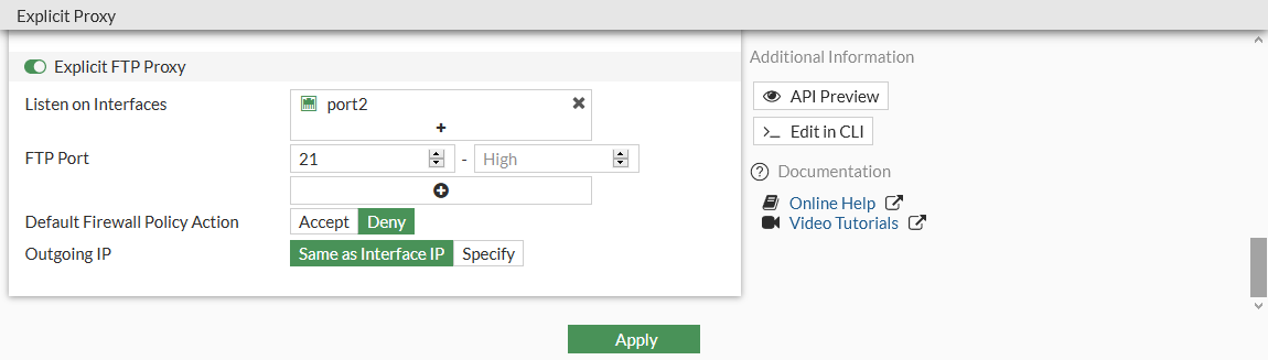 config system interface edit "port1" set ip 10.1.100.2 255.255.255.0 set explicit-ftp-proxy enable next end -