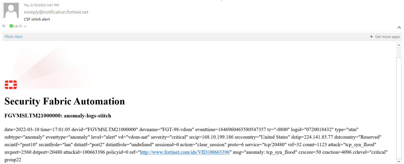 Once the anomaly log is generated, the automation stitch is triggered end the email notification is sent.