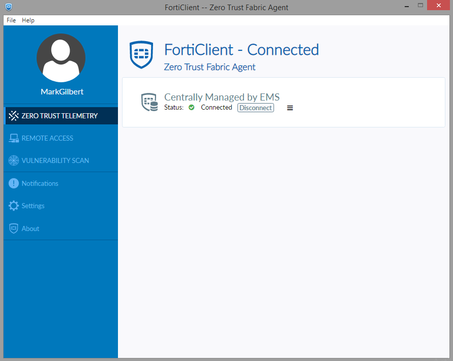 Once FortiClient connects to the FortiClient EMS, the Status shows up as Connected in the Zero Trust Telemetry tab.