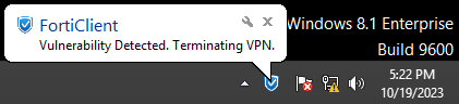 Based on the remote access profile configuration, the endpoint's access is denied due to the assigned Vulnerable ZTNA tag. The message configured in the remote access profile appears as a notification above the FortiTray icon (in the Windows system tray).
