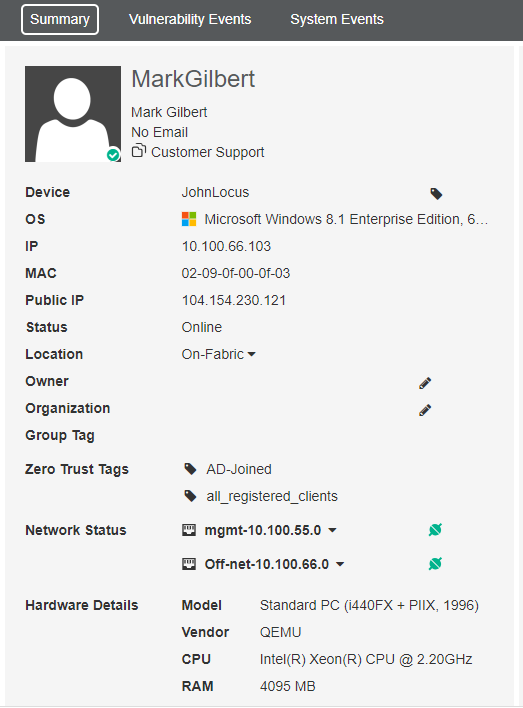 In the Summary pane, you can see the Zero Trust Tags associated with the endpoint. For example, this user has the AD-Joined and all_registered_clients tags.