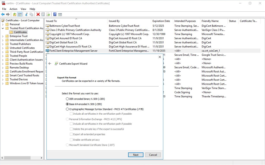 Right click on the certificate issued by FortiClient Enterprise Management Server and select All Tasks > Export.