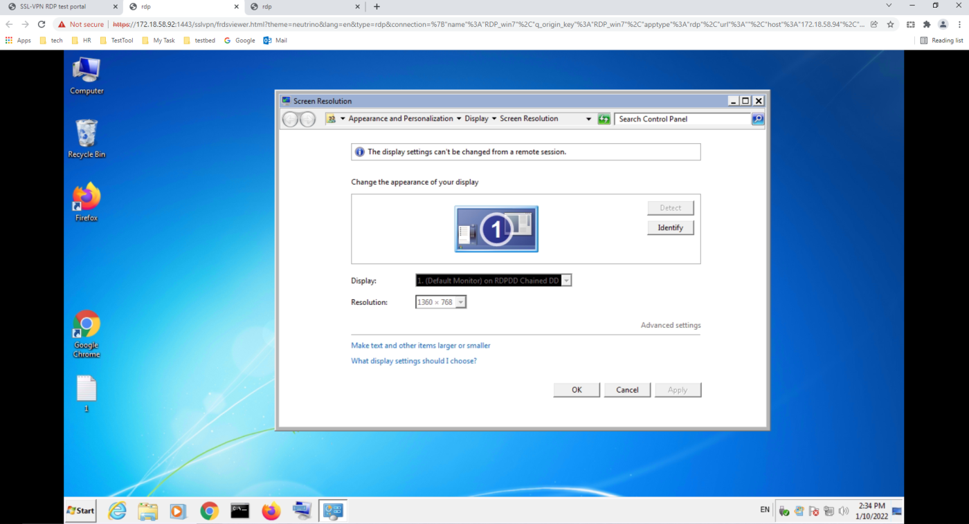 When the user connects to the RDP servers using the bookmarks, the customized screen resolutions are applied regardless of the client PC's screen resolution (1920 × 1080).