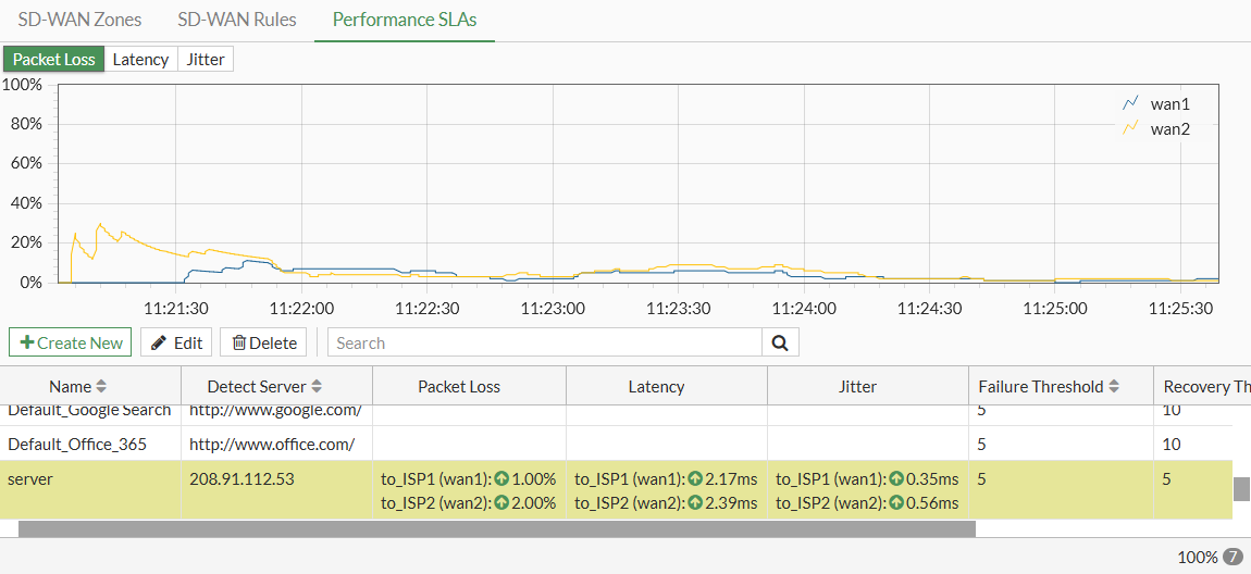 Go to Network > SD-WAN, select the Performance SLAs tab, and select the SLA from the table (server in this example) to view the packet loss, latency, and jitter on each SD-WAN member in the health check server.