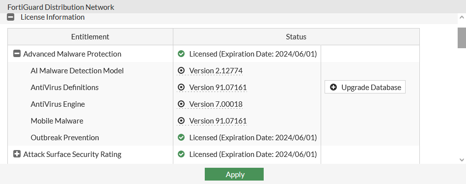 In the License Information table, expand the Advanced Malware Protection entitlement section and locate the Outbreak Prevention entry.