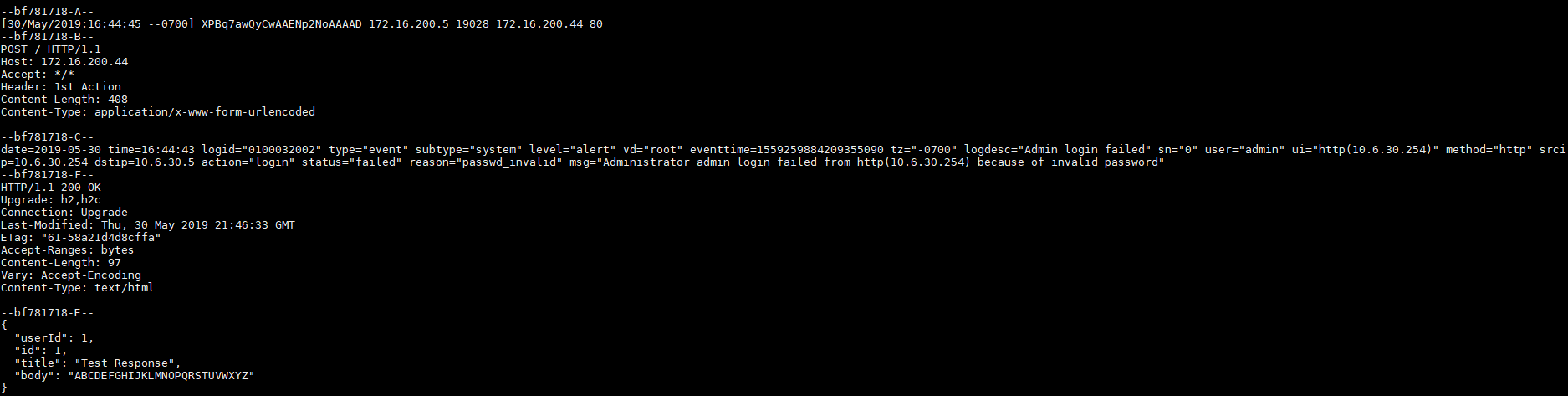 # diagnose test application autod 2 csf: enabled root:yes total stitches activated: 2 stitch: badLogin destinations: all trigger: badLogin local hit: 6 relayed to: 6 relayed from: 6 actions: Send Log To Server type:webhook interval:0 delay:0 required:no proto:0 method:0 port:80 uri: 172.16.200.44 http body: %%log%% headers: 0. Header:1st Action
