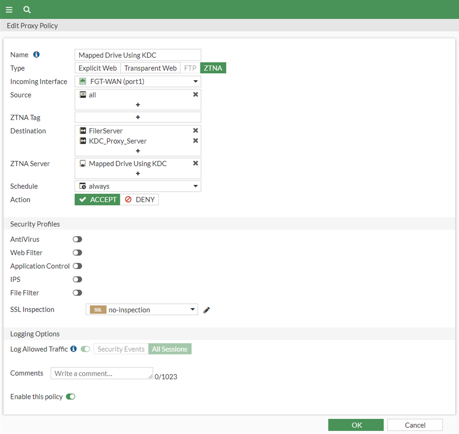 A ZTNA server and a proxy policy are required to verify and forward the incoming requests on port 10445 to the file server on port 445 as well as to the KDC proxy server on port 443.